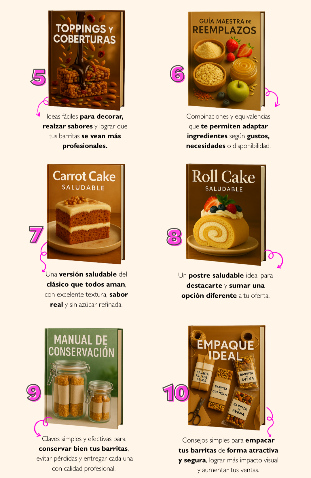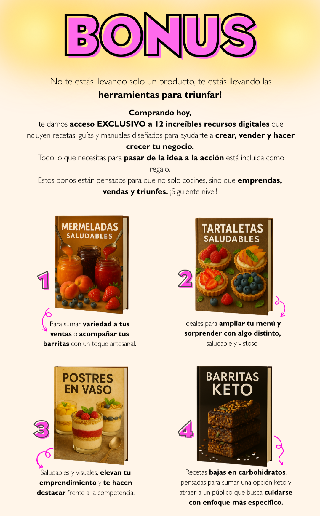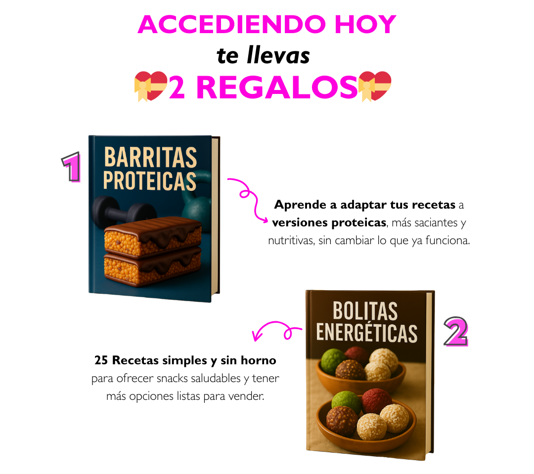 - 🎁 12 bonos extra: empaques, conservación, ventas, toppings, reemplazos y más.