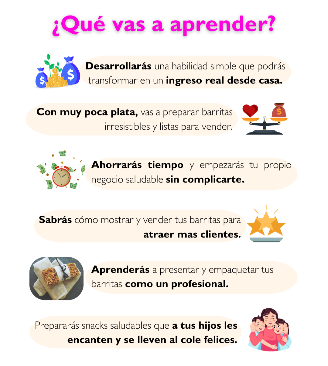 “Trabajo desde casa y buscaba una forma de ganar un ingreso extra. Las barritas son muy fáciles de hacer y más de vender. La alimentación saludable está en auge, hay que aprovechar 🌱”